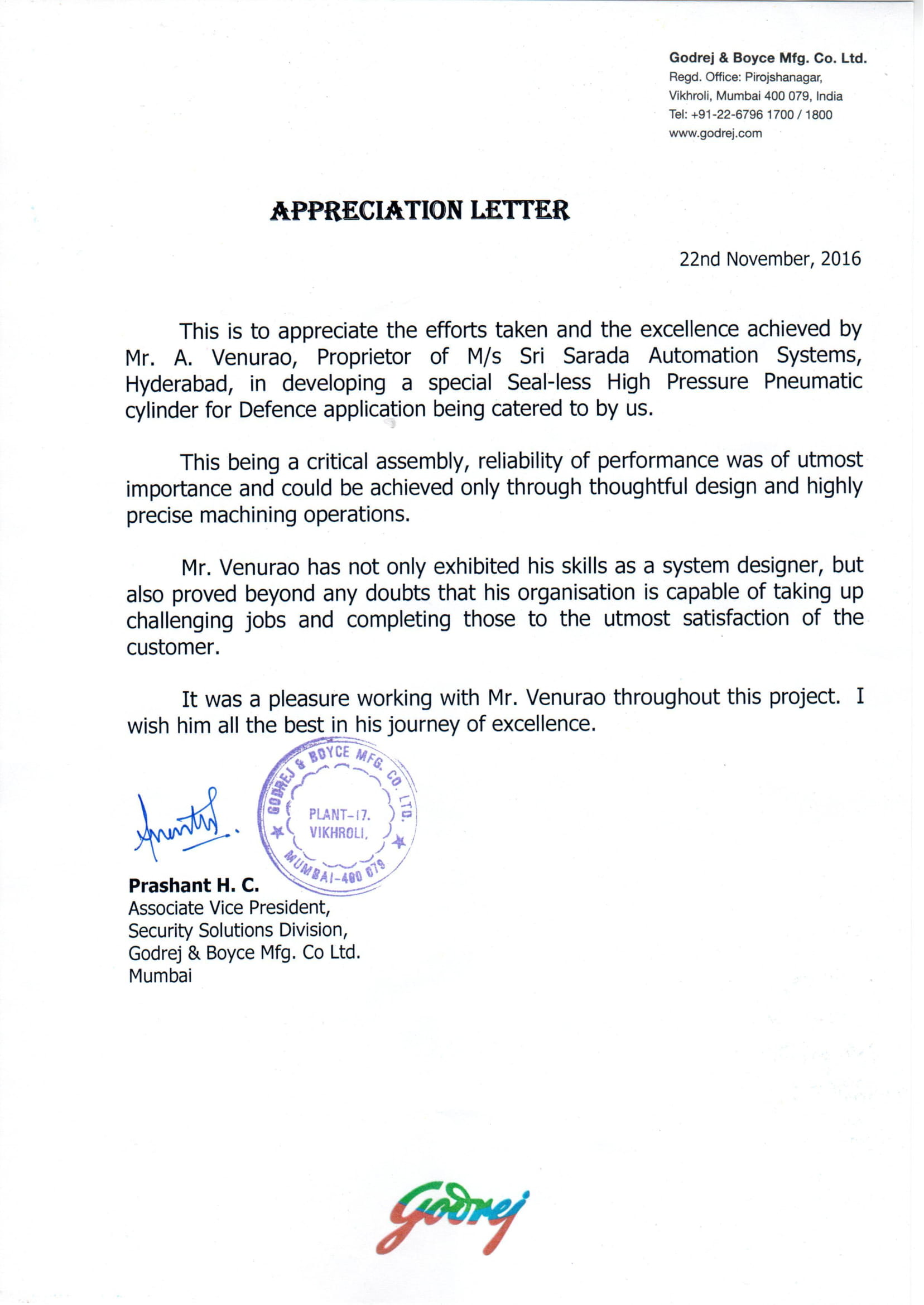 Letter from Godrej and Boyce: "This is to appreciate the efforts taken and the excellence achieved by Mr. A. Venurao, Proprietor of M/s Sri Sarada Automation Systems, Hyderabad, in developing a special Seal-less High Pressure Pneumatic cylinder for Defence application being catered to by us.