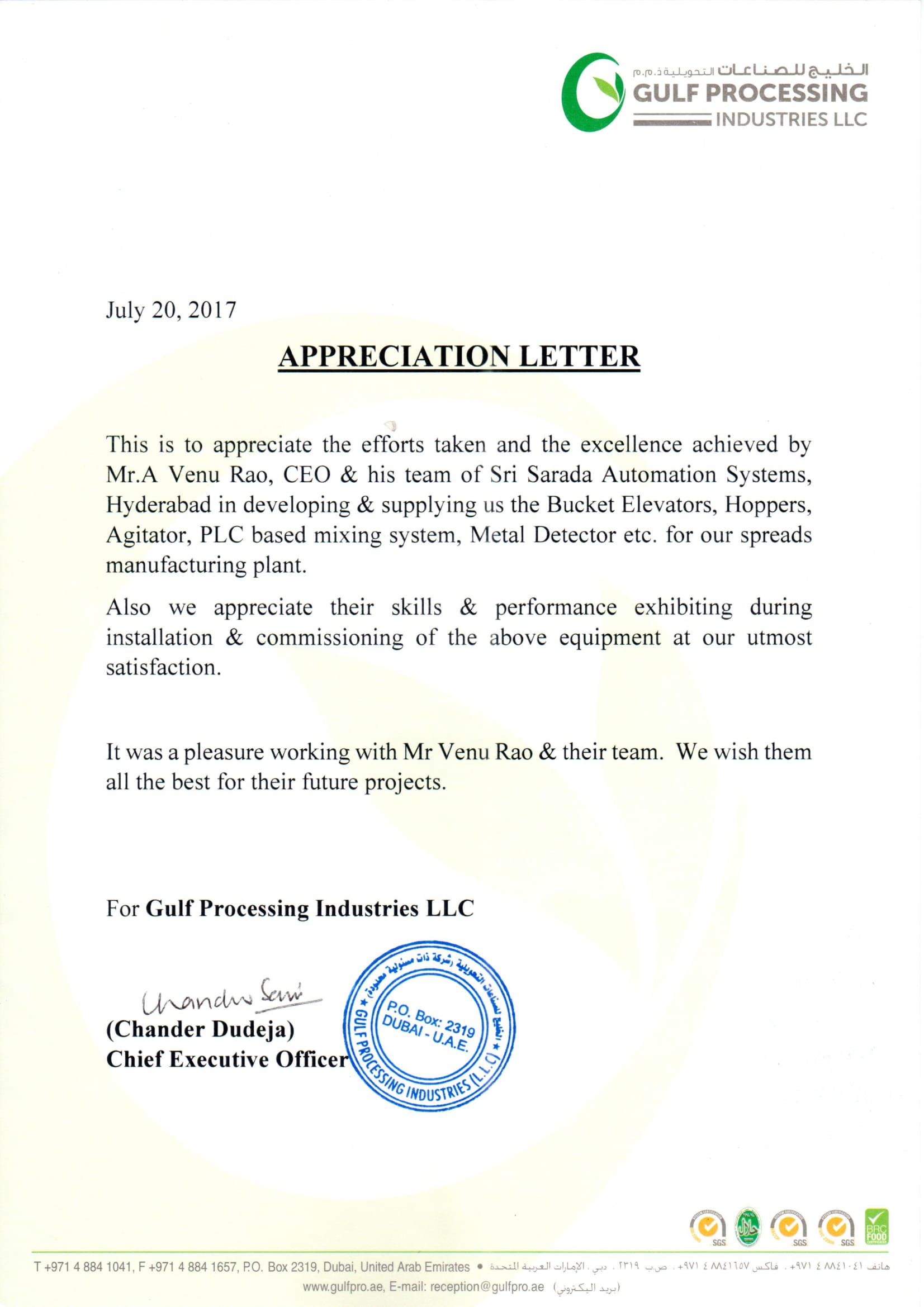 Gulf Processing Industries July 20th 2017: "This is to appreciate the efforts taken and the excellence achieved by Mr. A Venu Rao, CEO & his team of Sri Sarada Automation Systems, Hyderabad in developing & supplying us the Bucket Elevators, Hoppers, Agitator, PLC based mixing system, Metal Detector etc. for our spreads manufacturing plant. Also we appreciate their skills & performance exhibiting during installation & commissioning of the above equipment at our utmost satisfaction. It was a pleasure working with Mr Venu Rao & their team. We wish them all the best for their future projects."