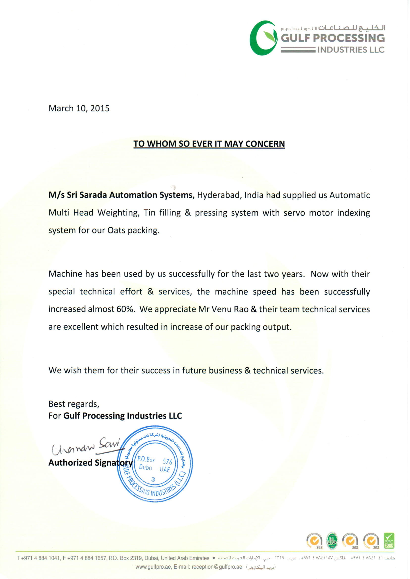 Gulf Processing Industries March 10th 2015: "M/s Sri Sarada Automation Systems, Hyderabad, India had supplied us Automatic Multi Head Weighing, Tin filling & pressing system with servo motor indexing system for our Oats packing. Machine has been used by us successfully for the last two years. Now with their special technical effort & services, the machine speed has been successfully increased almost 60%. We appreciate Mr Venu Rao & their team technical services are excellent which resulted in increase of our packing output. We wish them for their success in future business & technical services."